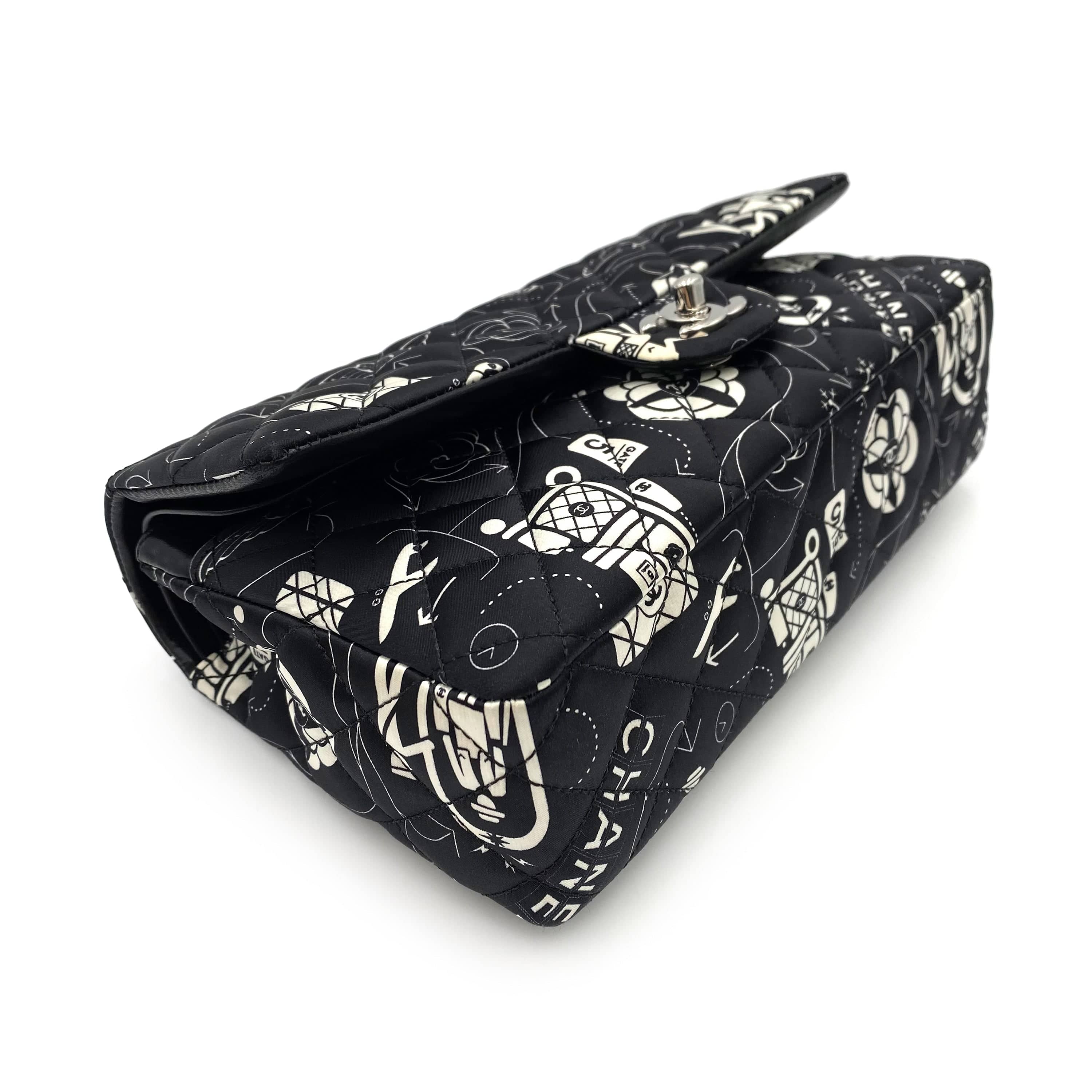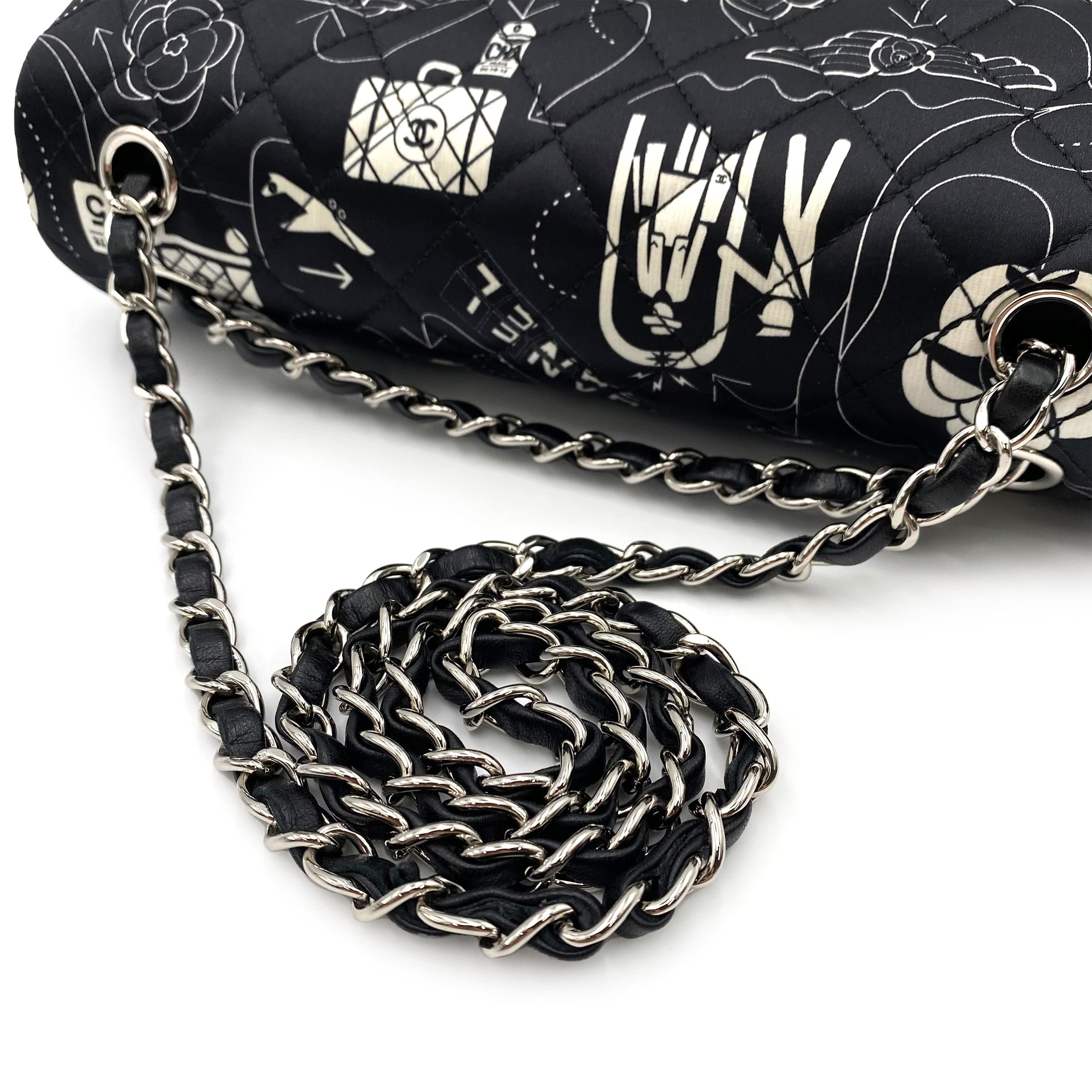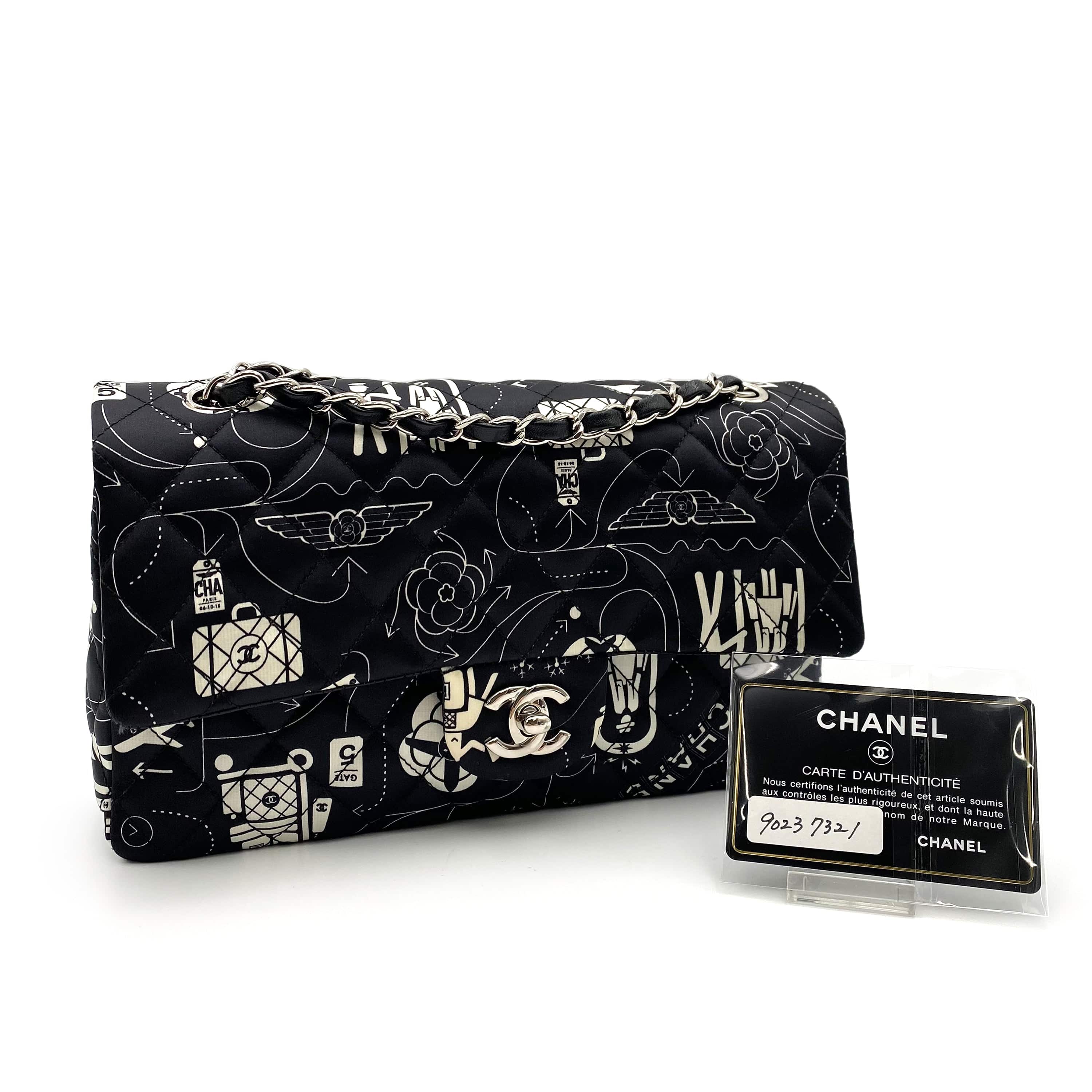 CHANEL AIRLINE CLASSIC FLAP MEDIUM CHAIN SHOULDER BAG BLACK WHITE SATIN 90237321