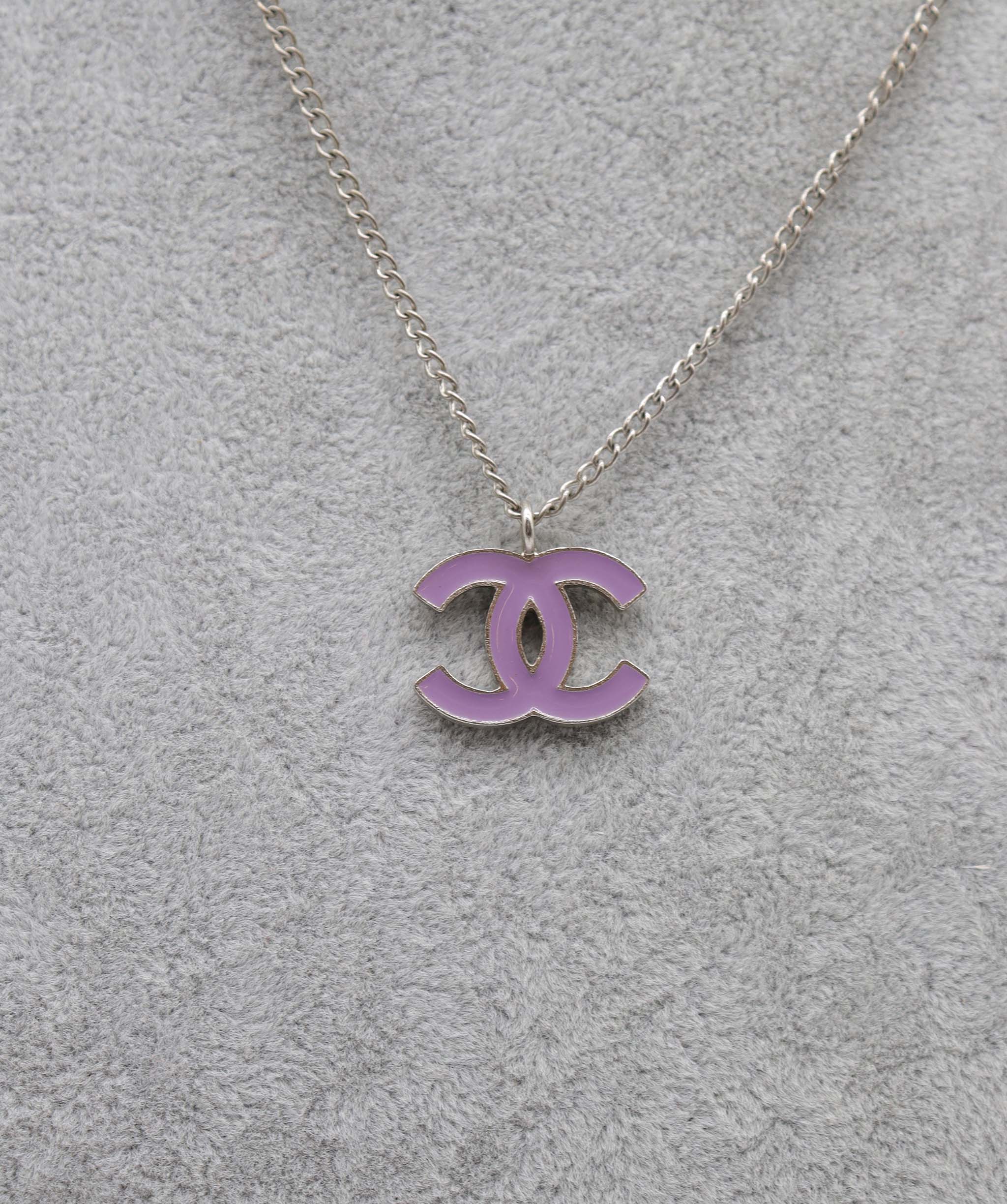 Description: This Silver Chanel necklace has a CC with purple setting.