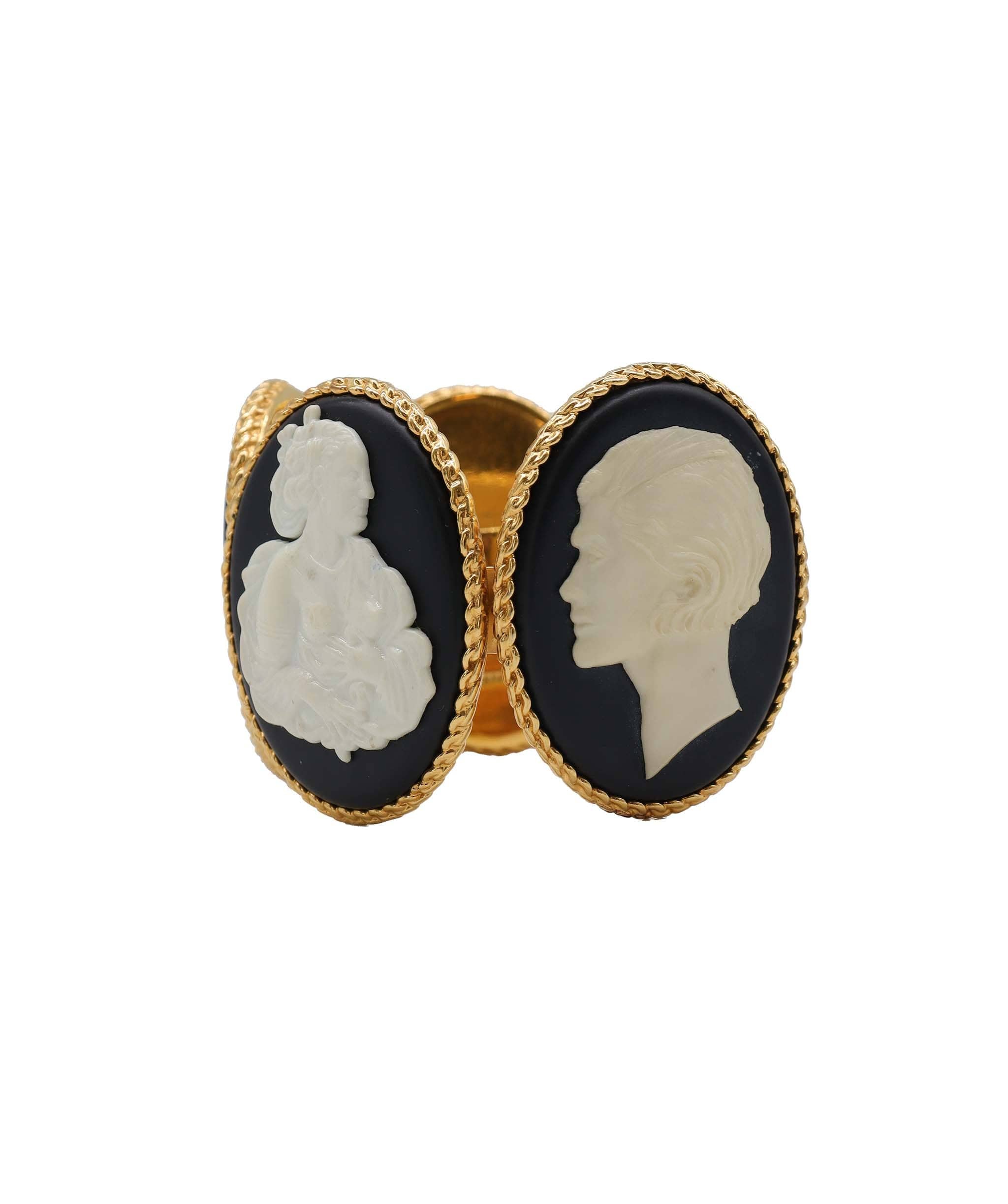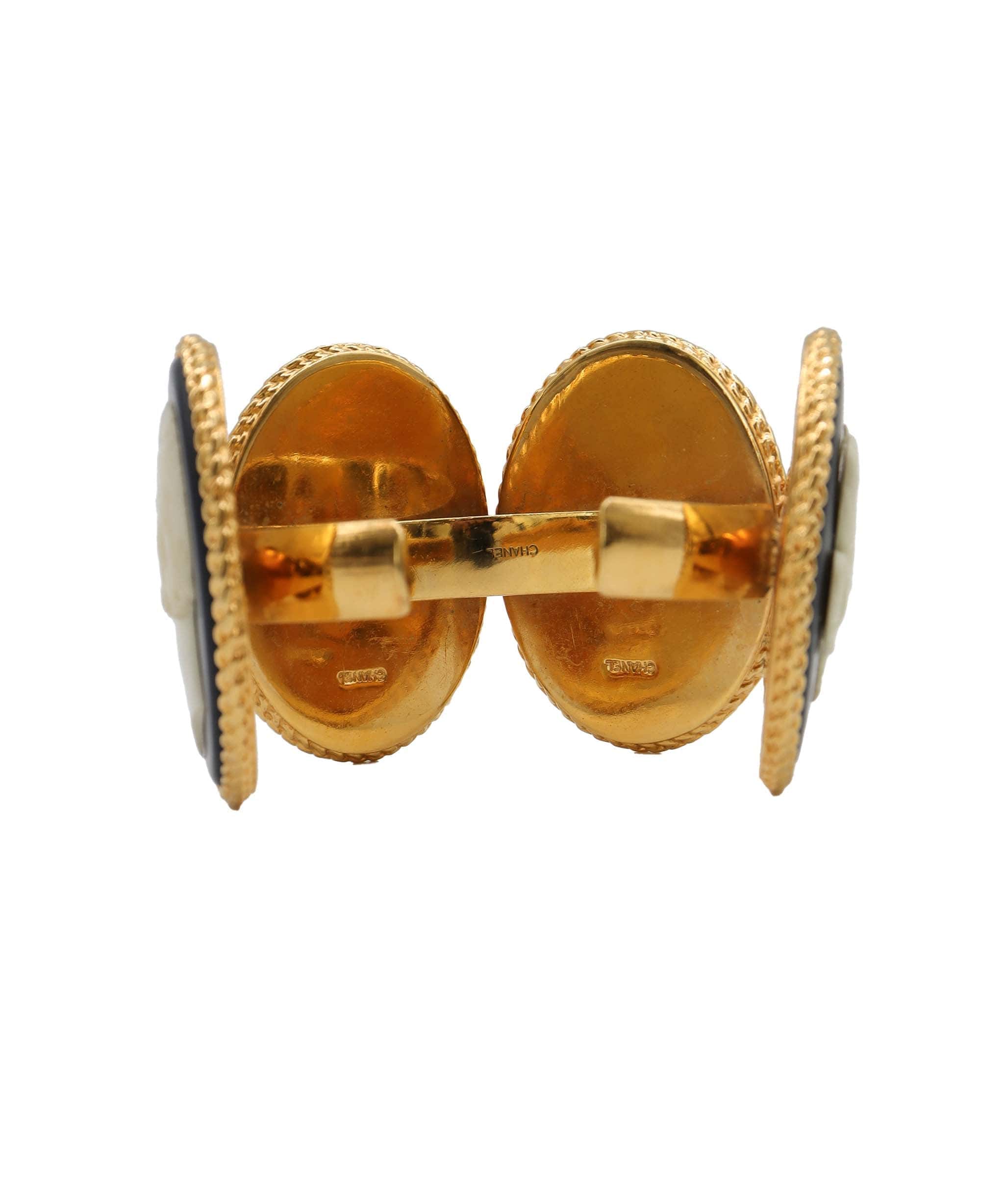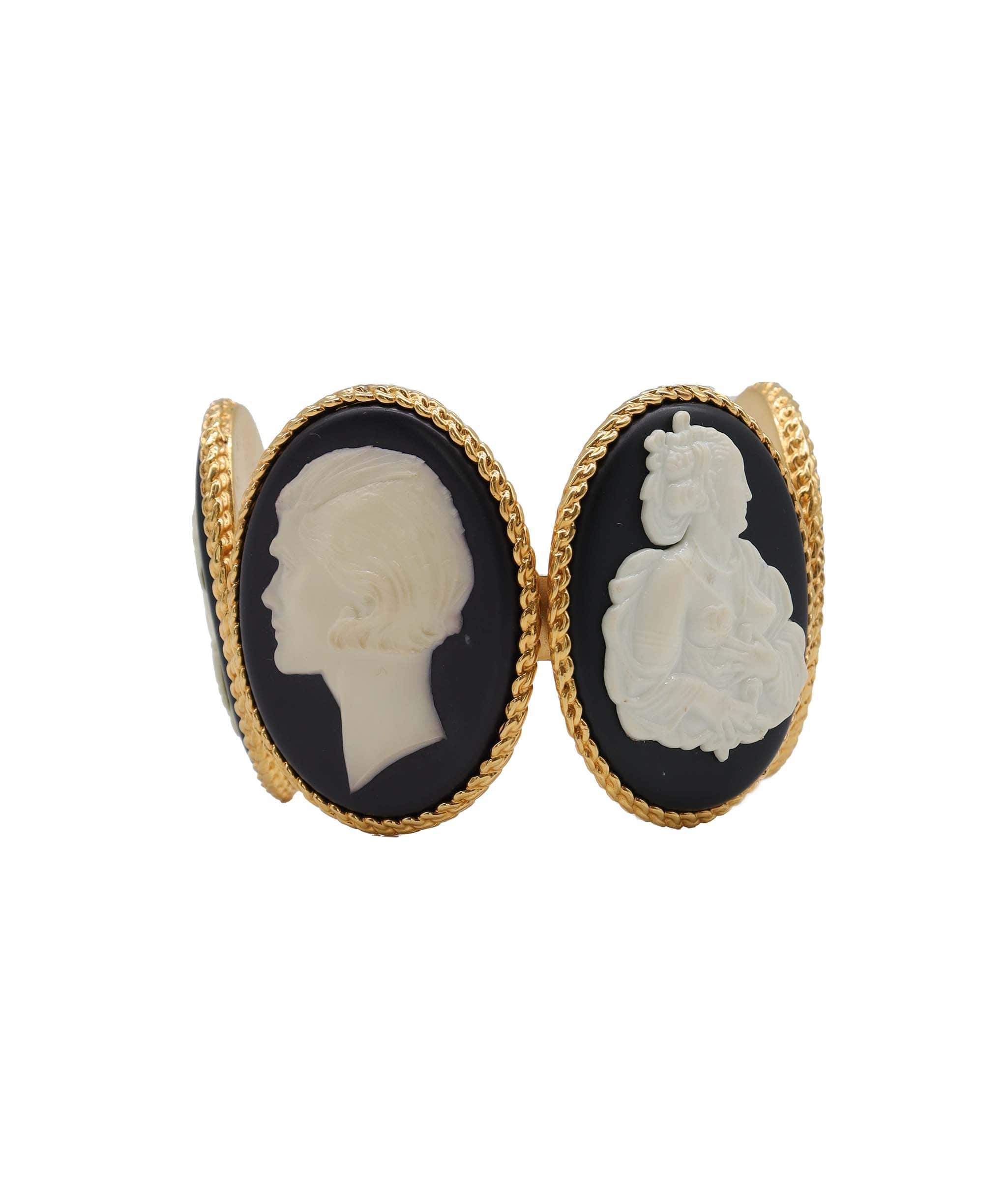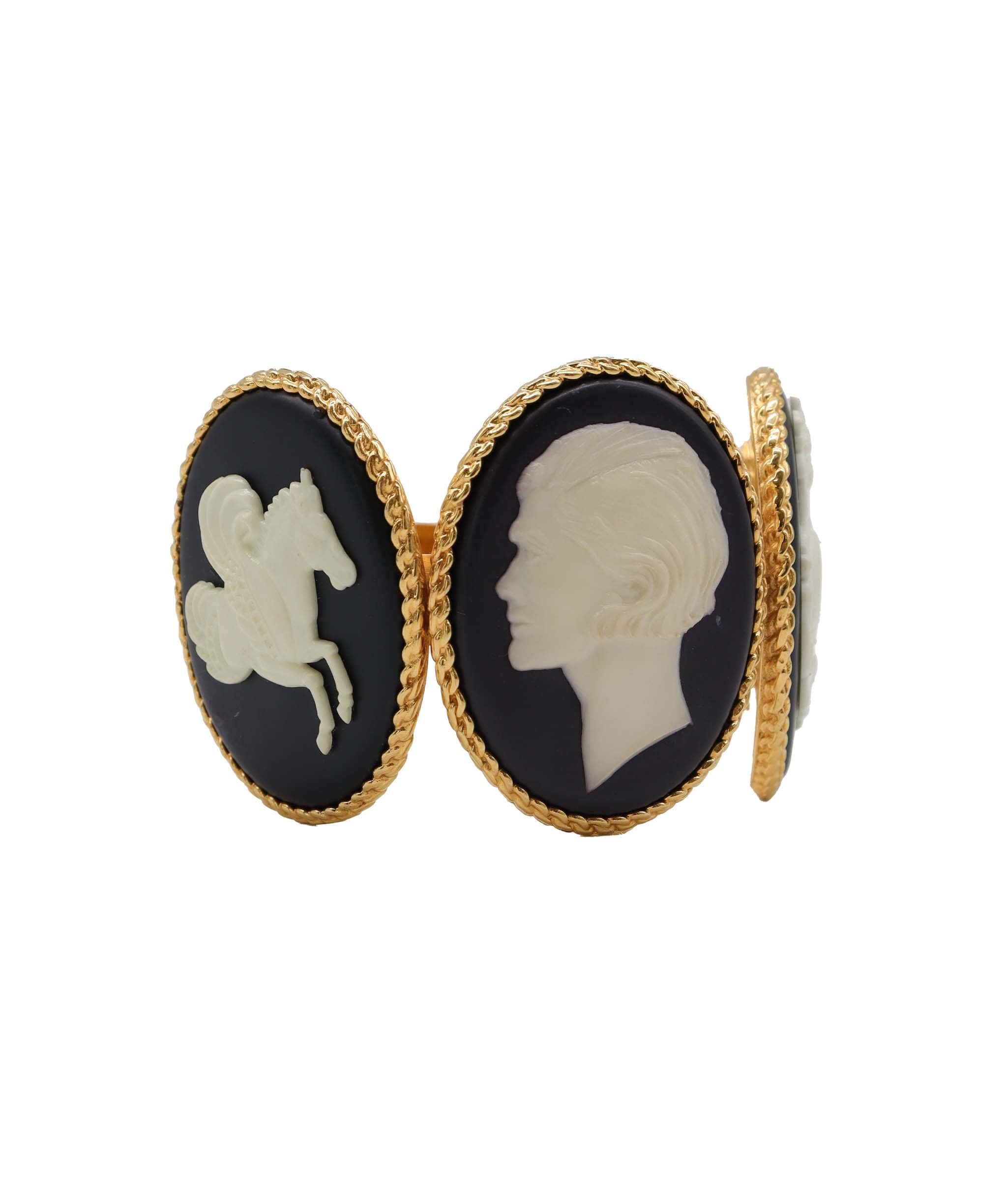 Description: This CHANEL COCO Horse Cameo Vintage 1990-1999 four-plate bangle bracelet in Gold Tone is a rare find that will make your outfit pop out.