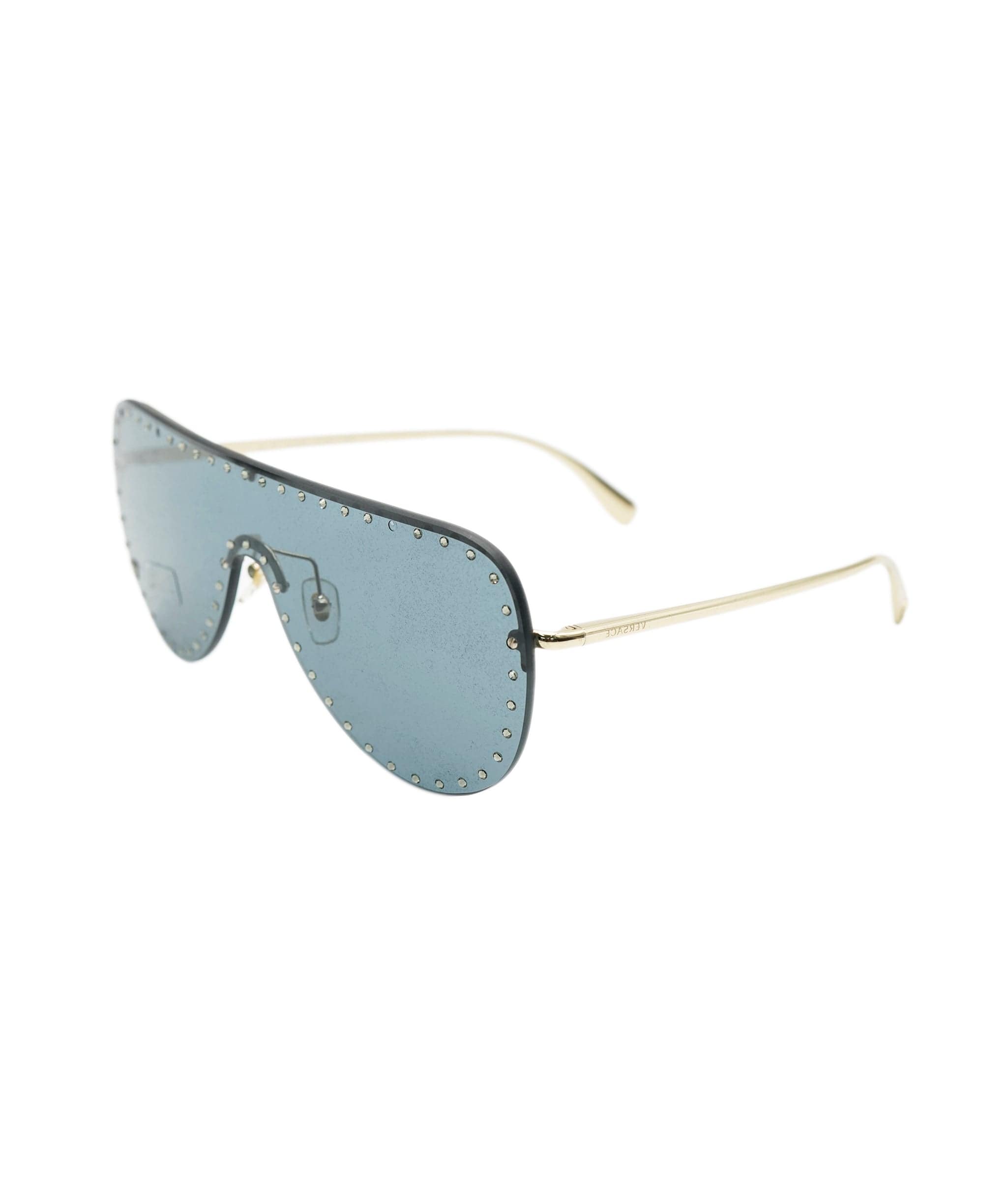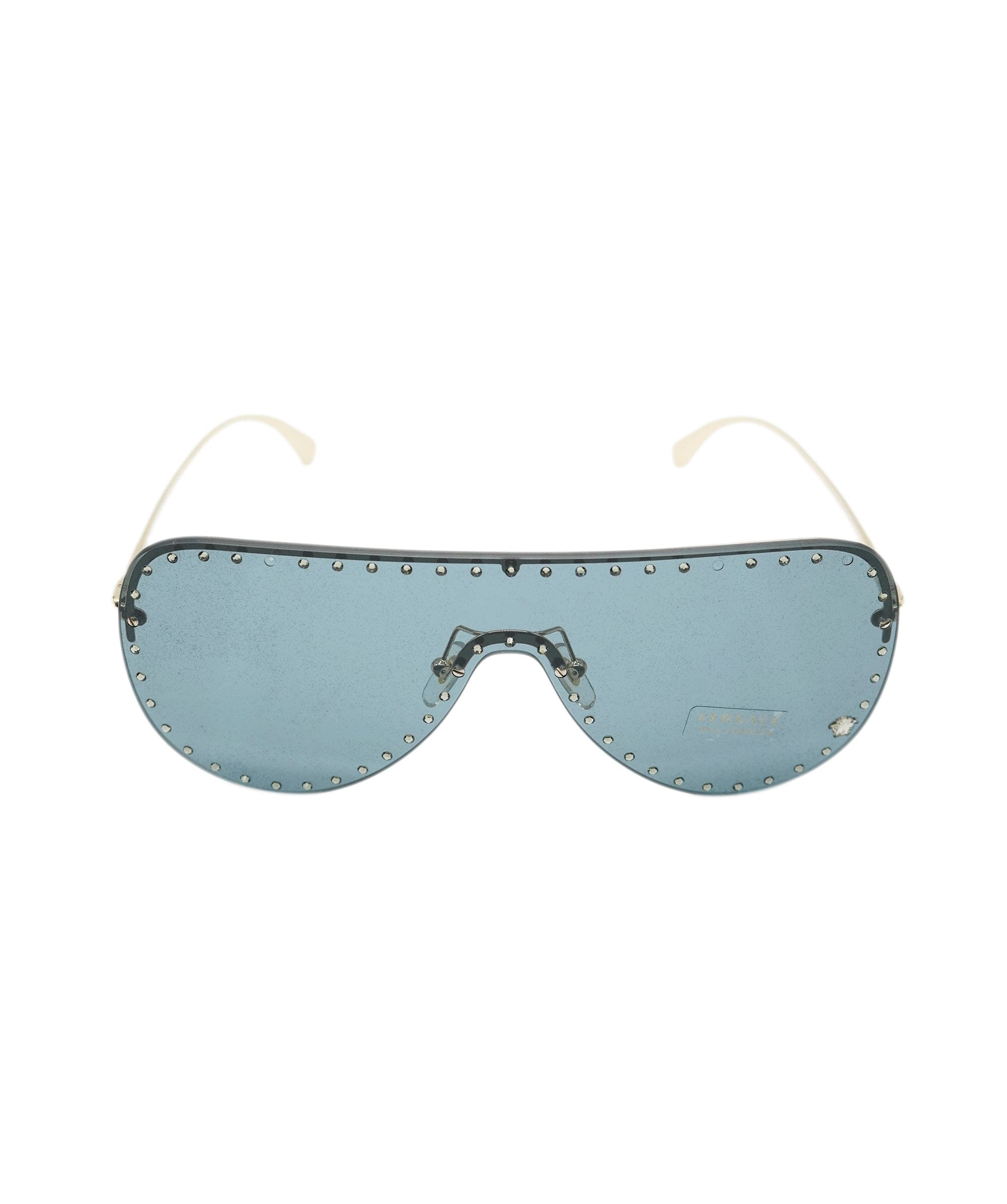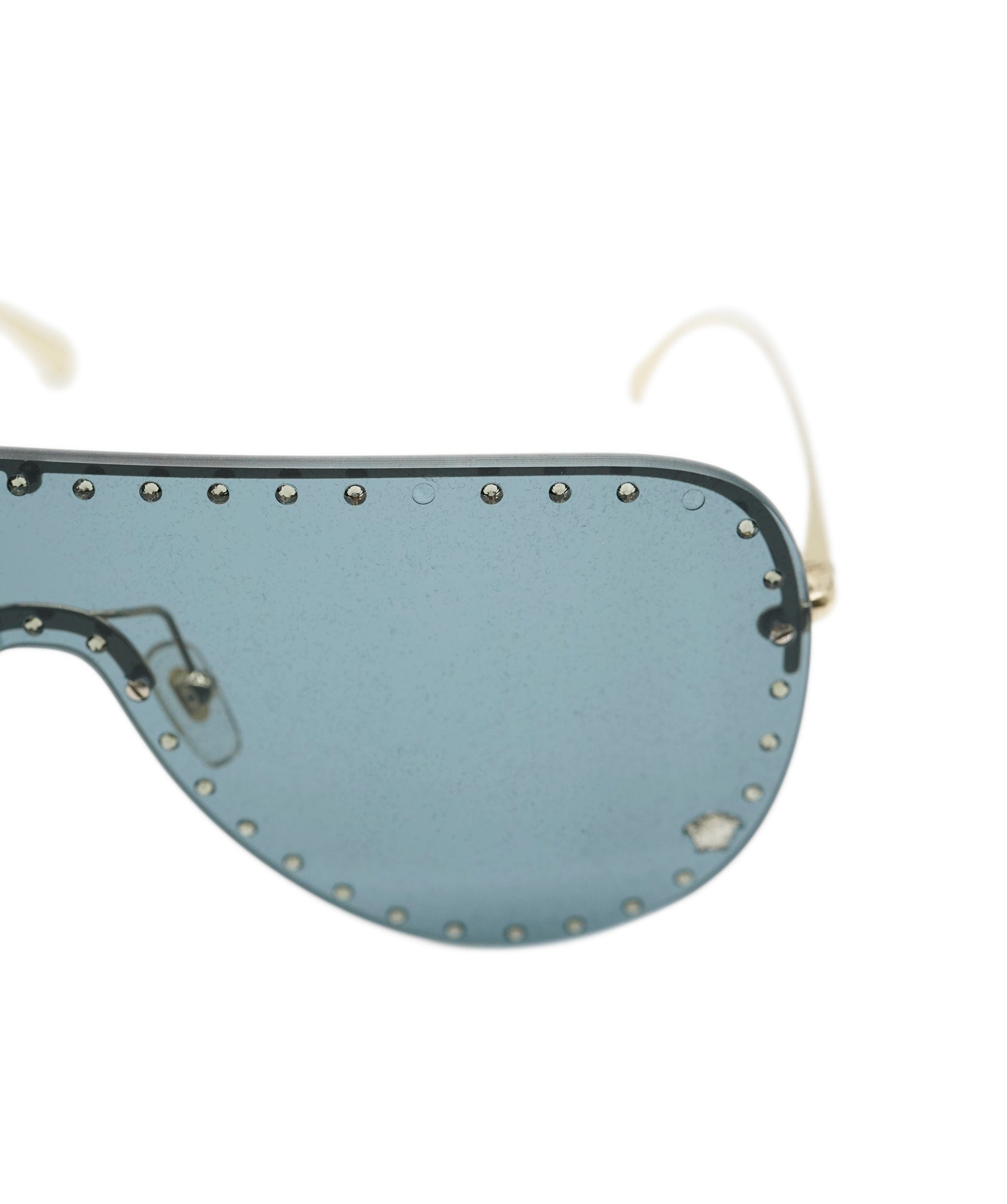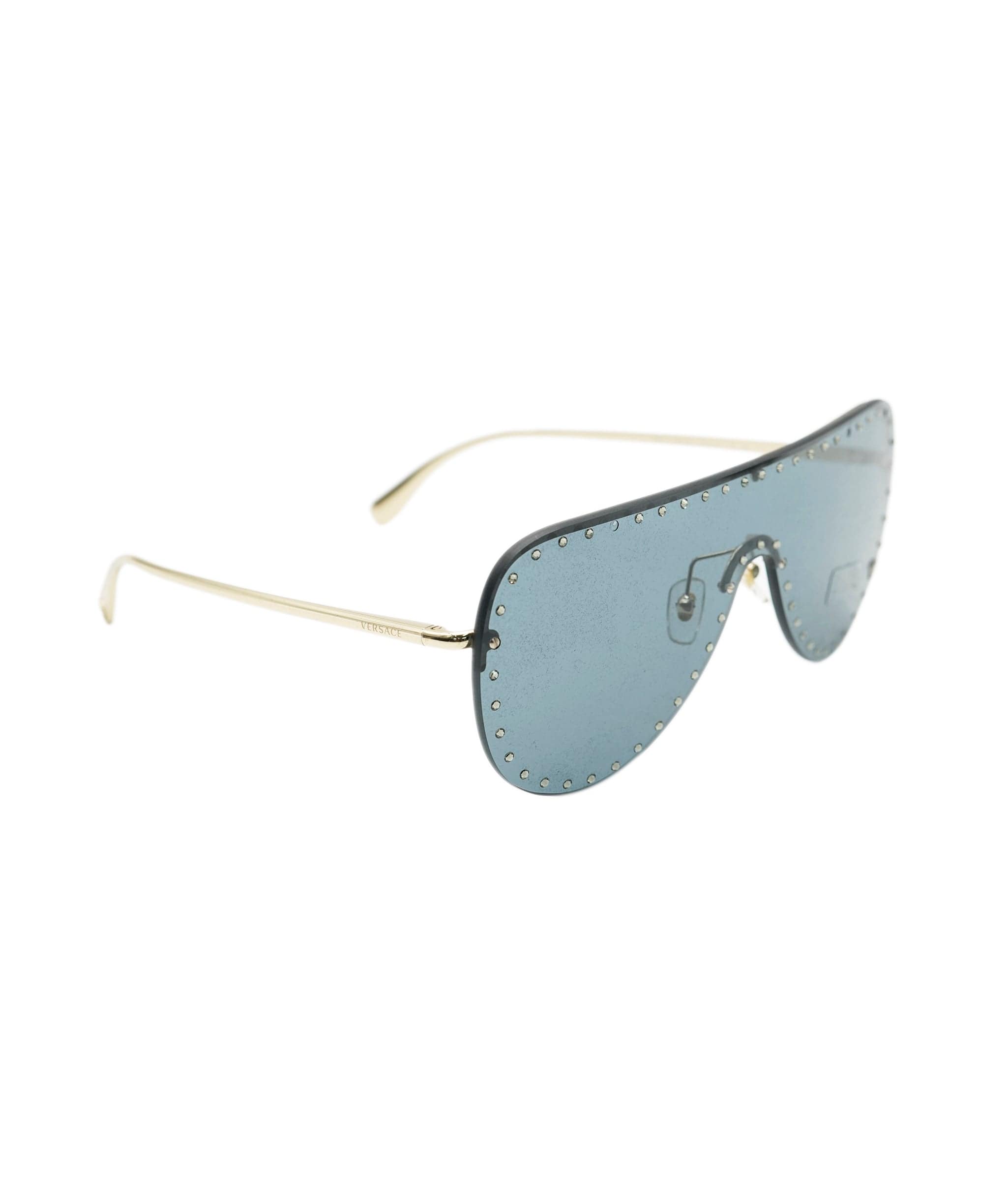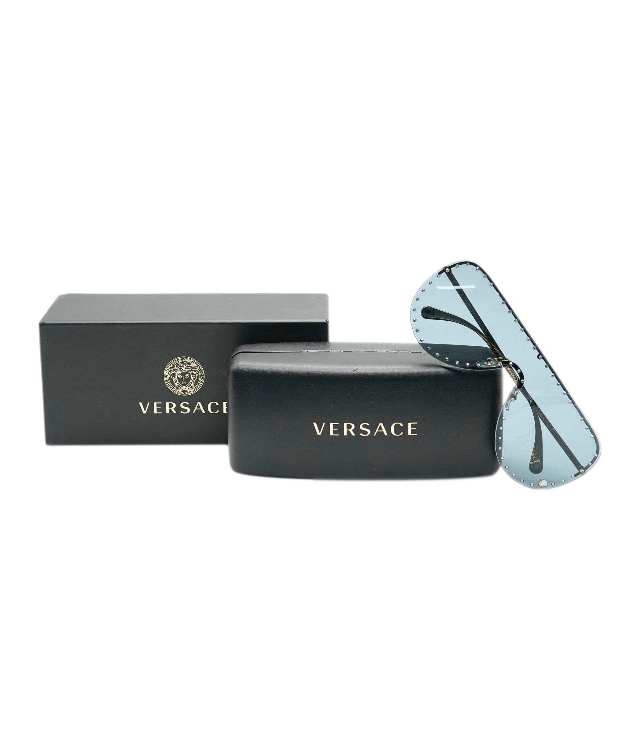 Description: Elevate your style with these striking Versace Shield sunglasses. Featuring a bold blue tint and unique shield design, these sunglasses make a statement wherever you go. They come with a sleek Versace case, ensuring they remain style-protected.